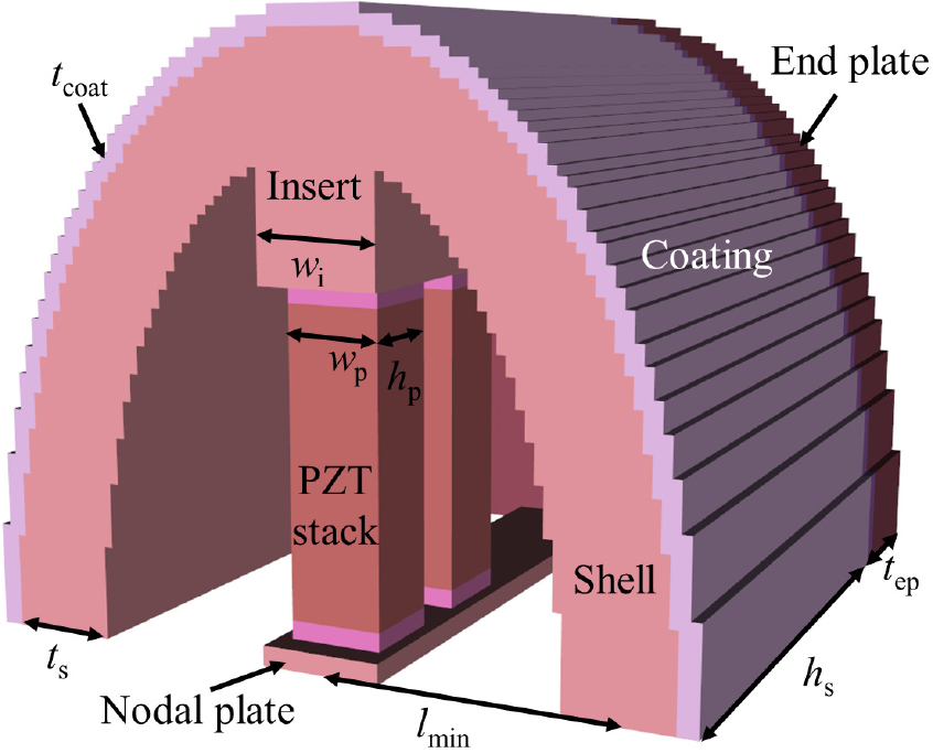 - Class IV flextensional transducers, which have been primarily employed for transmission, exhibit high sensitivity characteristics when utilised as hydrophones, attributable to the substantial mechanical amplification effect and the reciprocity of the piezoelectric effect. The present study has been conducted with the objective of developing a class IV flextensional hydrophone that possesses both high sensitivity and a wide bandwidth in the low frequency range. The influence of structural variables on the acoustic performance was evaluated through finite element analysis, with the receiving voltage sensitivity and fractional bandwidth established as the primary performance indicators. Subsequently, regression analysis and optimization algorithms were employed to derive the optimal structure. The final model exhibited a 21 %p increase in bandwidth while maintaining the same receive voltage sensitivity in the low frequency range compared to the basic model.