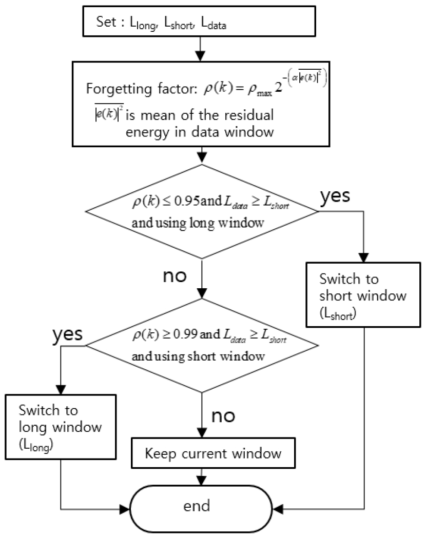 - This paper proposes a dual sliding window method to enhance the performance of the Iterative Wiener Filter (IWF) algorithm in time-varying environments. While the conventional IWF algorithm demonstrates excellent convergence performance while addressing the numerical instability issues of Recursive Least Squares (RLS), its tracking performance in time-varying environments is limited. The proposed dual sliding window IWF dynamically selects between long and short windows based on channel change detection, providing fast tracking with a short data window during channel transitions and maintaining high estimation accuracy with a long data window in steady-state conditions. Simulation results confirm that the proposed method achieves improved tracking performance compared to IWF using a single window length in time-varying channel environments.