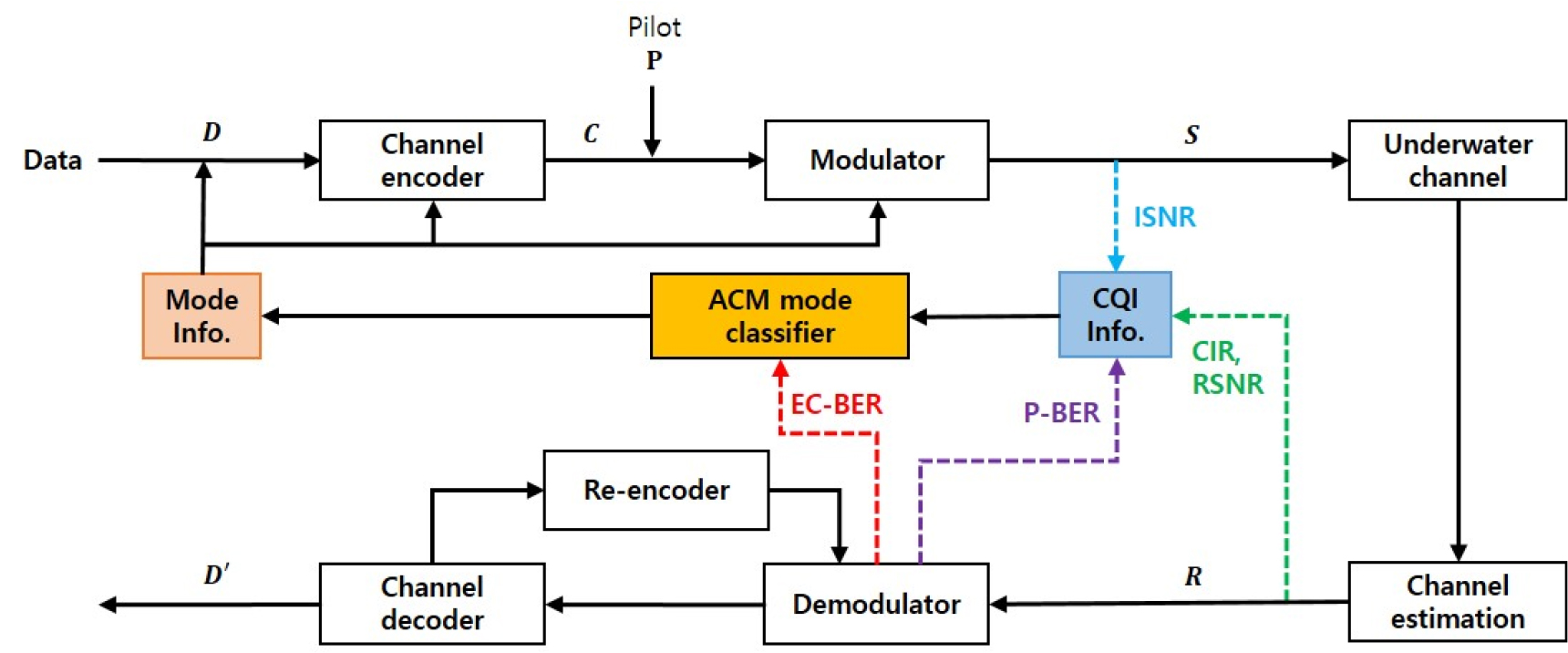 - This paper proposes a Machine Learning (ML) based Adaptive Coding and Modulation (ACM) scheme that dynamically selects the optimal transmission mode in Underwater Acoustic Communication (UAC) environments with highly time-varying characteristics and high propagation loss. The proposed method uses four types of Channel Quality Indicators (CQI) as input features, including Input Signal-to-Noise Ratio (ISNR), Received Signal-to-Noise Ratio (RSNR), Pilot Bit Error Rate (P-BER), and Channel Impulse Response (CIR), to predict the optimal ACM mode while maintaining both communication success probability and transmission efficiency. To improve the reliability of the classifier, only received data set that meet a specific estimated coded bit error rate (EC-BER) threshold are used for training. A random forest classifier is employed to implement the ACM system, achieving an accuracy of approximately 98.7 % in simulations. Compared to conventional fixed transmission schemes, the proposed method which adaptivel y selects the optimal mode achieves up to twice the transmission rate under various channel conditions.
