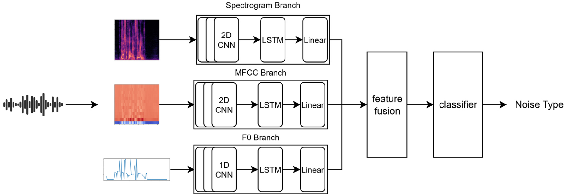 - Understanding and classifying various types of noise is crucial for improving the robustness of speech processing models. While previous studies have primarily focused on environmental noise such as white noise and background noise, the effects of speech manipulation including pitch shift and time stretch have been relatively less explored. This study proposes a noise classification model that can effectively distinguish various types of noise including speech manipulation to overcome these limitations. We constructed a noise dataset of 538,000 samples using LibriSpeech, Voice Cloning ToolKit (VCTK), DSD-Corpus, and TIMIT datasets, and designed a Multi-Feature Fusion model that integrates spectrogram, MFCC, and F0 features. The proposed model achieved 95 % accuracy with 7.2 M parameters, demonstrating suitable lightweight characteristics for real-time preprocessing. This suggests that noise classification-based adaptive preprocessing can effectively contribute to enhancing the robustness of speech processing models in various noise environments.